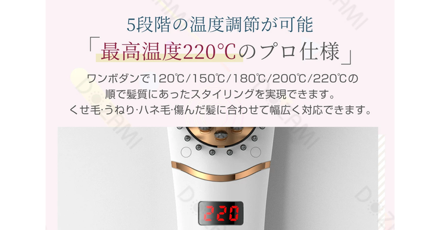 さらに、120〜220℃までの5段階温度設定で、髪質や仕上がりの好みに合わせて細かく調整可能。