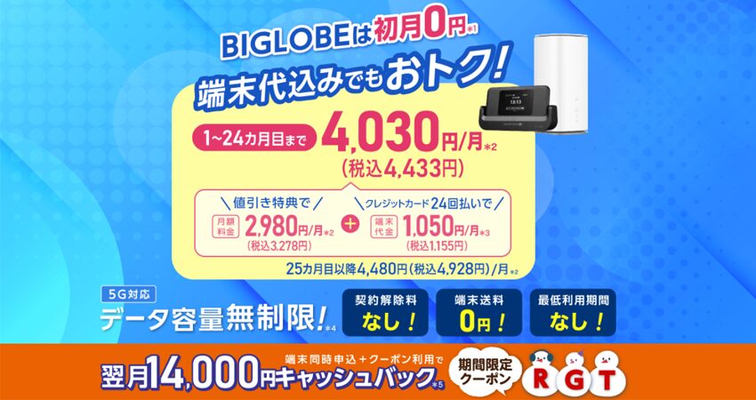 BIGLOBE WiMAX +5Gは、初月0円・1〜24カ月目3,278円(税込)で使えるWiMAX+5Gサービス。