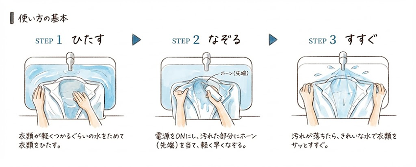 - 洗剤をなじませたあと、UW-X1の先端を軽く押し当てながらゆっくりと移動させる。