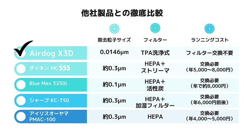 - 理論上は シャープやダイキンよりさらに細かい粒子まで除去可能 ということになります。実売価格は8〜10万円と他機種の2〜3倍以上ですが、Airdogは 水洗いして繰り返し使えるため、トータルコストの良さが評価されています。
