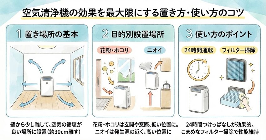 同じ空気清浄機でも、置き方や運転の仕方で「効き目」が大きく変わります。ここでは、どの機種にも共通するポイントをまとめました。