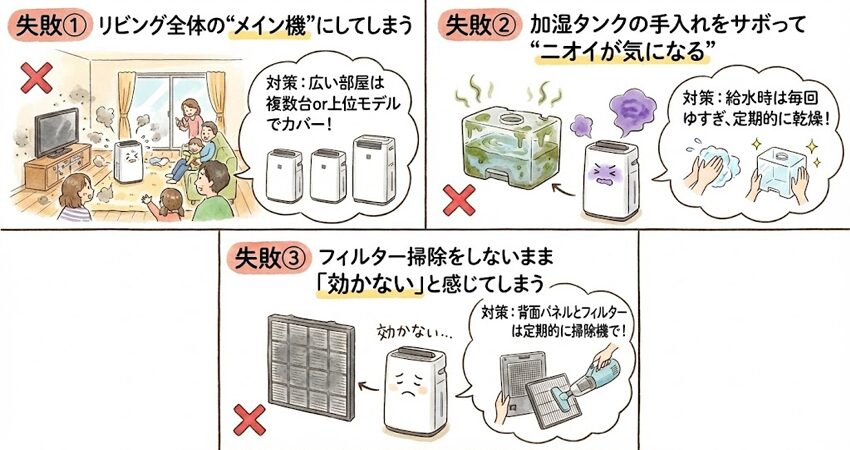 口コミを見ていると、「シャープ KC-T50 自体は悪くないのに、選び方や使い方を間違えて損をしている」ケースも見かけます。