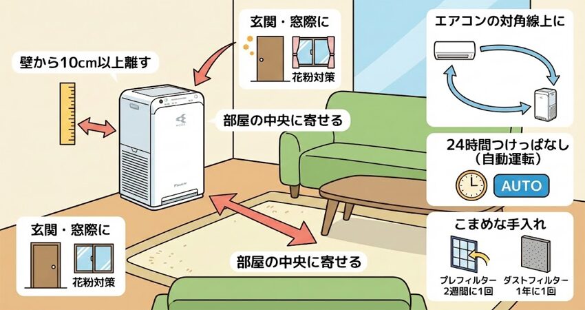 MC555はスペックだけ見ると「25畳対応のハイパワーモデル」ですが、置き場所や使い方次第で体感性能が大きく変わる機種です。ここでは、リビングや寝室でのおすすめの使い方をまとめました。