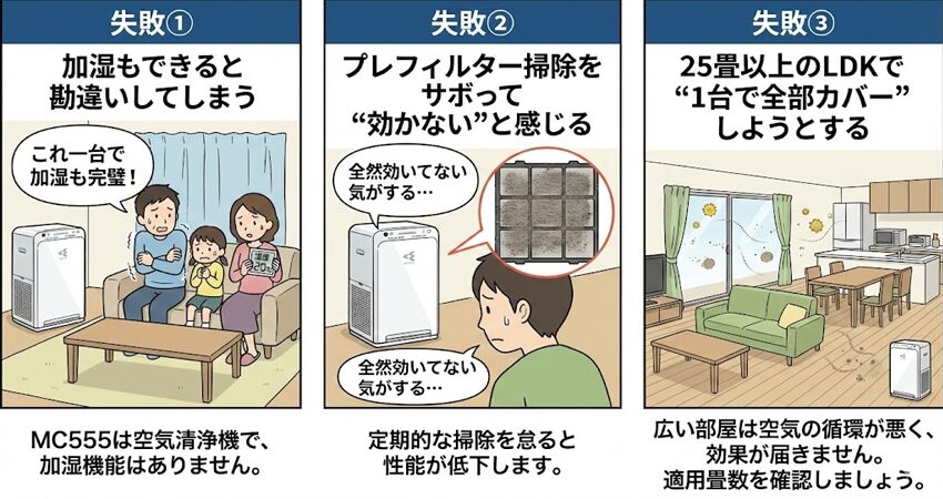 「ニオイ・花粉はMC555」「加湿は専用加湿器」という役割分担もおすすめです。