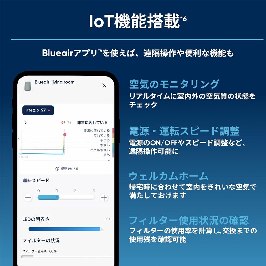 専用アプリ連携で室内/屋外の空気質の可視化、リモート操作、フィルター寿命の確認などが可能。