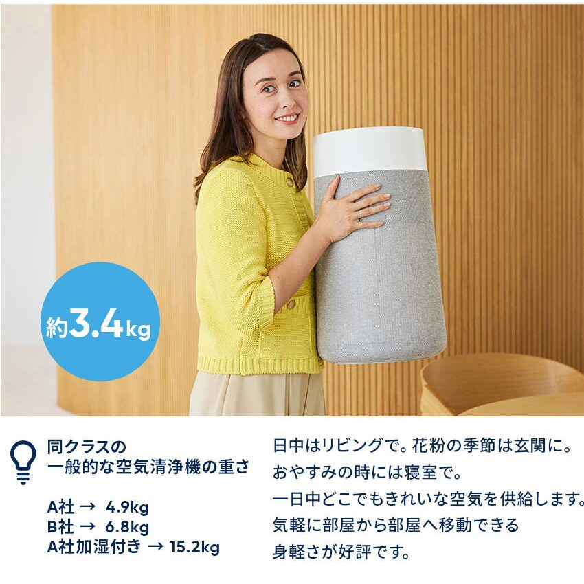 3.4kgで私でも動かせる。掃除ロボの導線を邪魔しない“キューブ型”が地味に良い。デザインも北欧家電らしく主張しない。