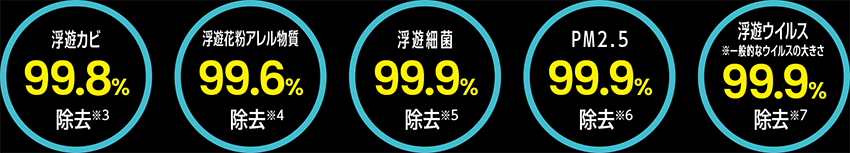 特筆すべきは 最小除去粒子サイズ0.0146μm。花粉(約30μm)やPM2.5(2.5μm)はもちろん、ウイルス(0.1μm前後)よりもはるかに小さな粒子まで捕集できる性能を誇ります。