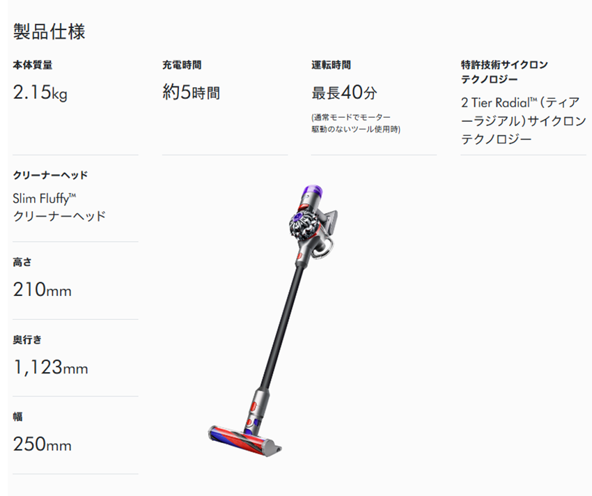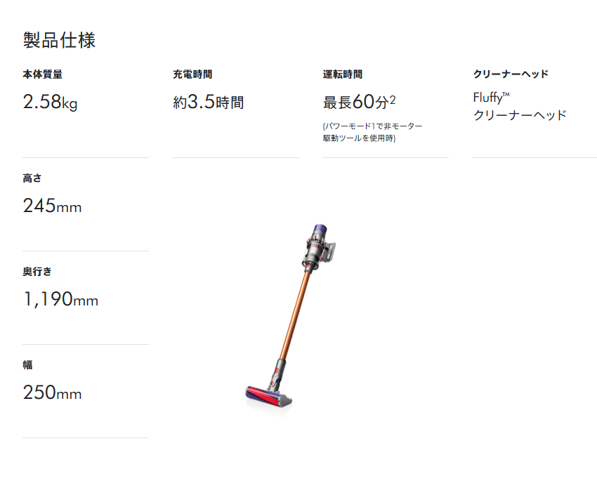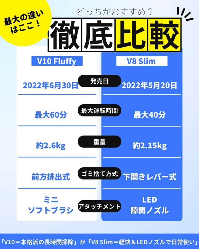 - Dyson V10 Fluffy(2022年6月発売) は「スタミナと吸引力の安心感」