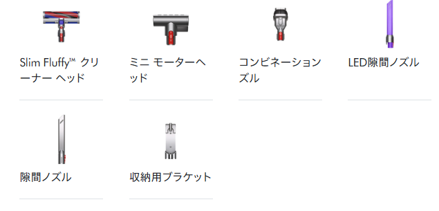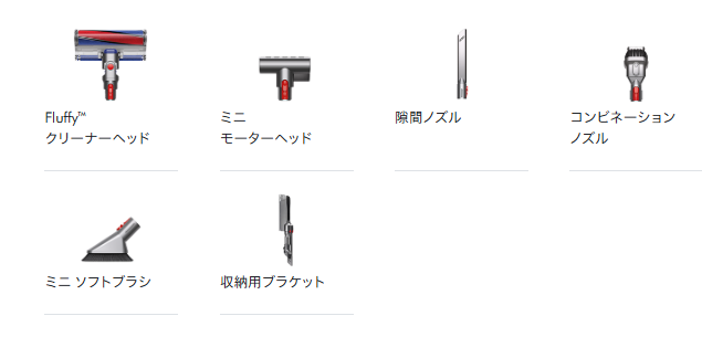 - V10 Fluffy:ソフトローラー/ミニモーターヘッド/コンビネーションノズル/隙間ノズル/ミニソフトブラシ。