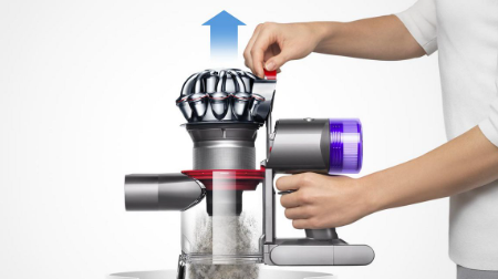 V8 Slim:下開きレバー式。シンプルだがホコリが舞いやすい。