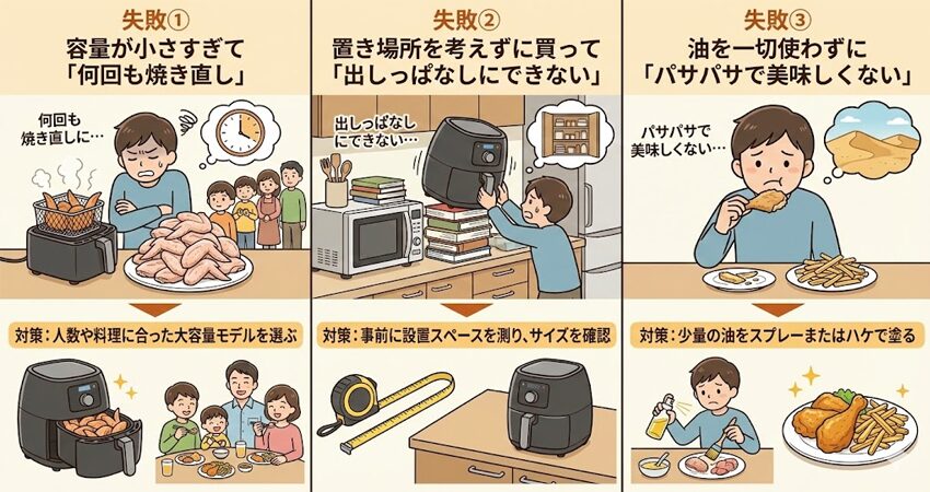 実際の口コミを見ていると、電気フライヤー自体は高評価なのに「選び方」や「使い方」を間違えて損をしているケースも多いです。ここでは、ありがちな失敗パターンと対策をまとめました。