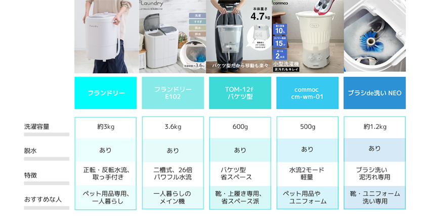 一人暮らしのワンルームに置けるメイン機としてはもちろん、靴やユニフォーム、ペット用品など「メイン洗濯機では洗いたくないもの専用」にも便利。
