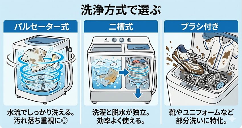 - ・パルセーター式:水流でしっかり洗える。汚れ落ち重視に◎