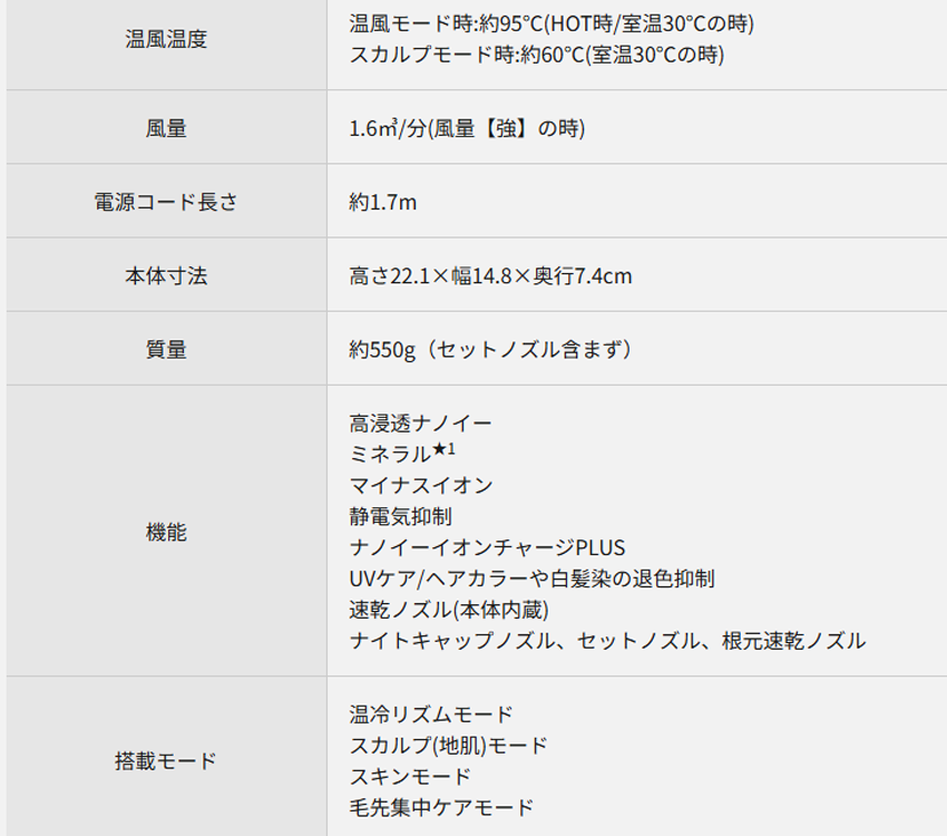 - モード:HOT、温冷リズム、毛先集中ケア、冷風、スカルプ(約60℃)、スキン