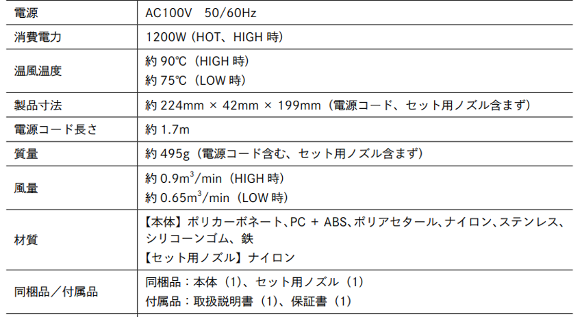 - 機能:マイナスイオン、6モード切替(冷風/温風×3段階)