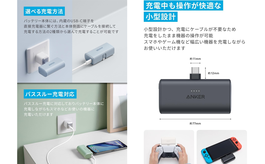 • パススルー充電:スマホとバッテリーを同時に充電。