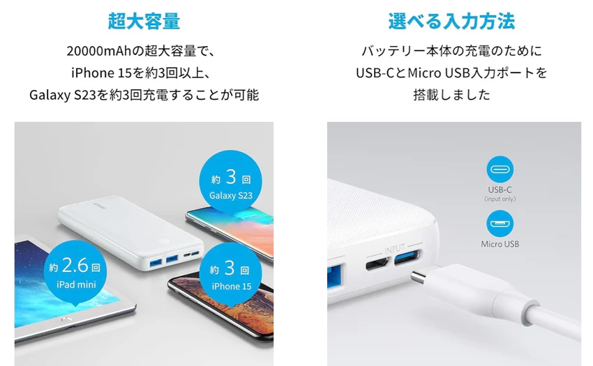 • 20,000mAh以上:旅行や出張、災害対策に安心の大容量。