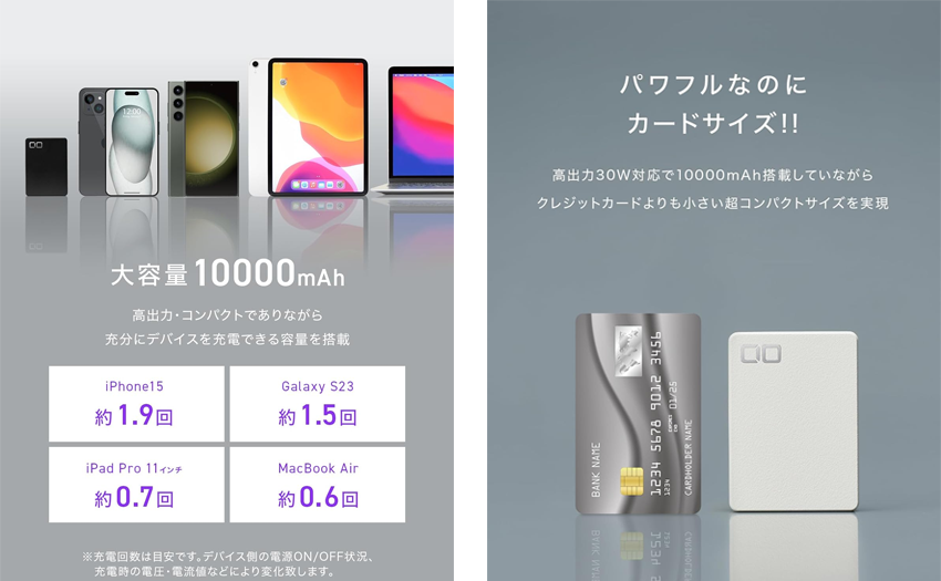 メリット:ケーブルを持ち歩く必要なし・軽量で携帯性抜群・出力が強力でスマホ急速充電可能