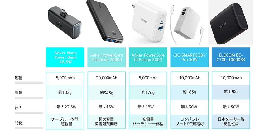 本記事では、数あるモバイルバッテリーの中から 「信頼性」「使いやすさ」「容量」「充電スピード」 の観点で厳選したおすすめモデルを5つご紹介。
