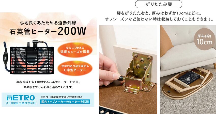 - 薄型ヒーターで足元スペースを確保。正座・あぐら・椅子座りでも膝が当たりにくい。