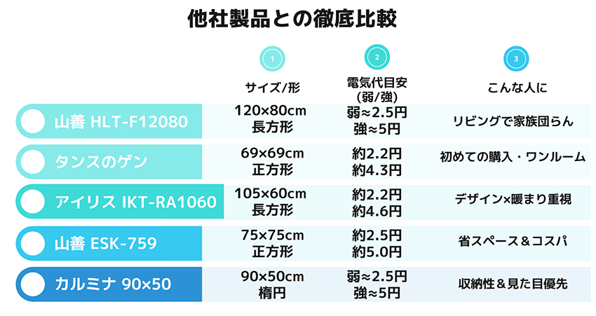 迷ったら「サイズ→ヒーター方式→デザイン→電気代」の順で絞り込めばOK。