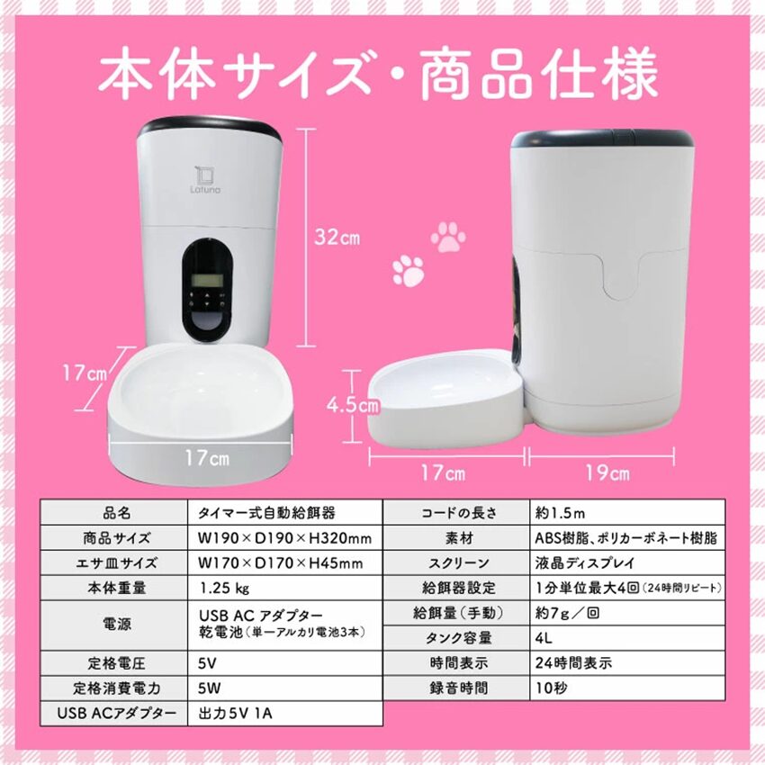 - 給餌量:1回分(約5~7g)~最大20回分まで設定可能
