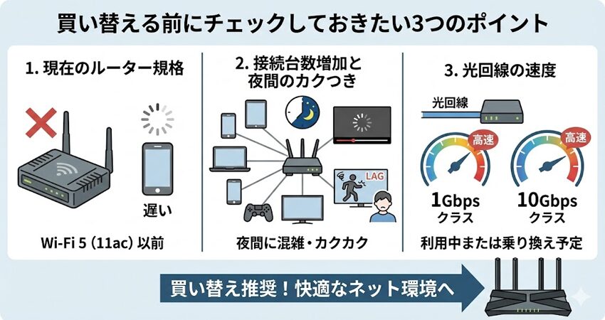 WX11000T12と7200D8BEはどちらもハイエンド寄りのルーターなので、そもそも「本当に今、買い替えるべきか?」を一度整理しておくと失敗しにくくなります。