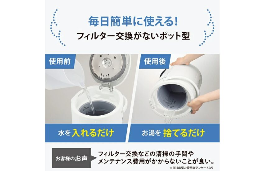 面倒なフィルター交換やカビ掃除が不要で、タンク内はフッ素加工の内容器だから汚れもつきにくい。