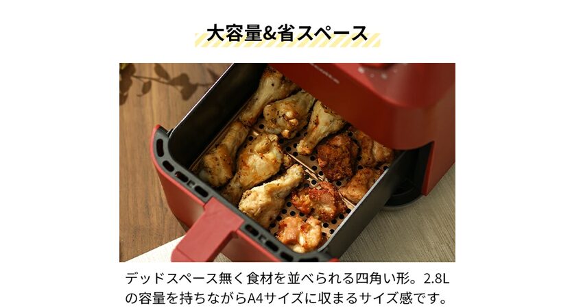 わずか幅21cmのコンパクトボディなのに、1200Wのパワーでカリッと仕上がる2.8L容量(実用2.4L)。
