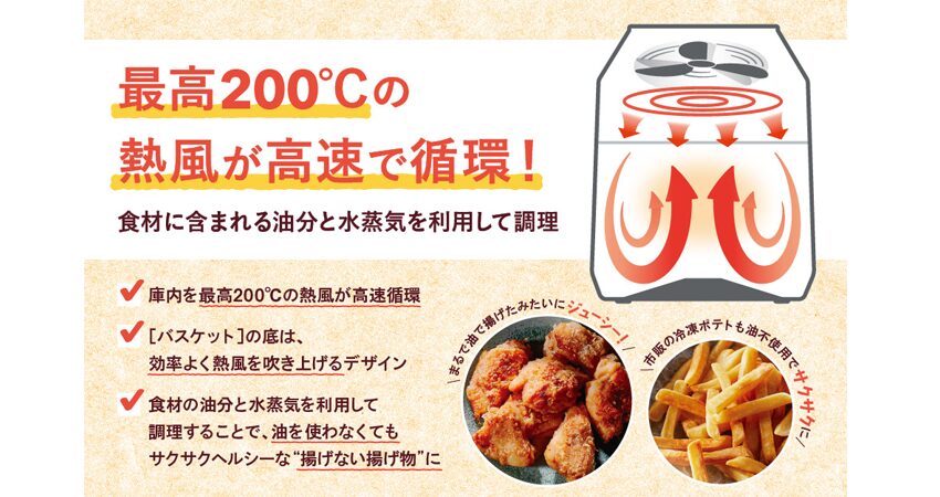 しかも、内部の360°熱風循環構造により、油を使わずにしっかり加熱。